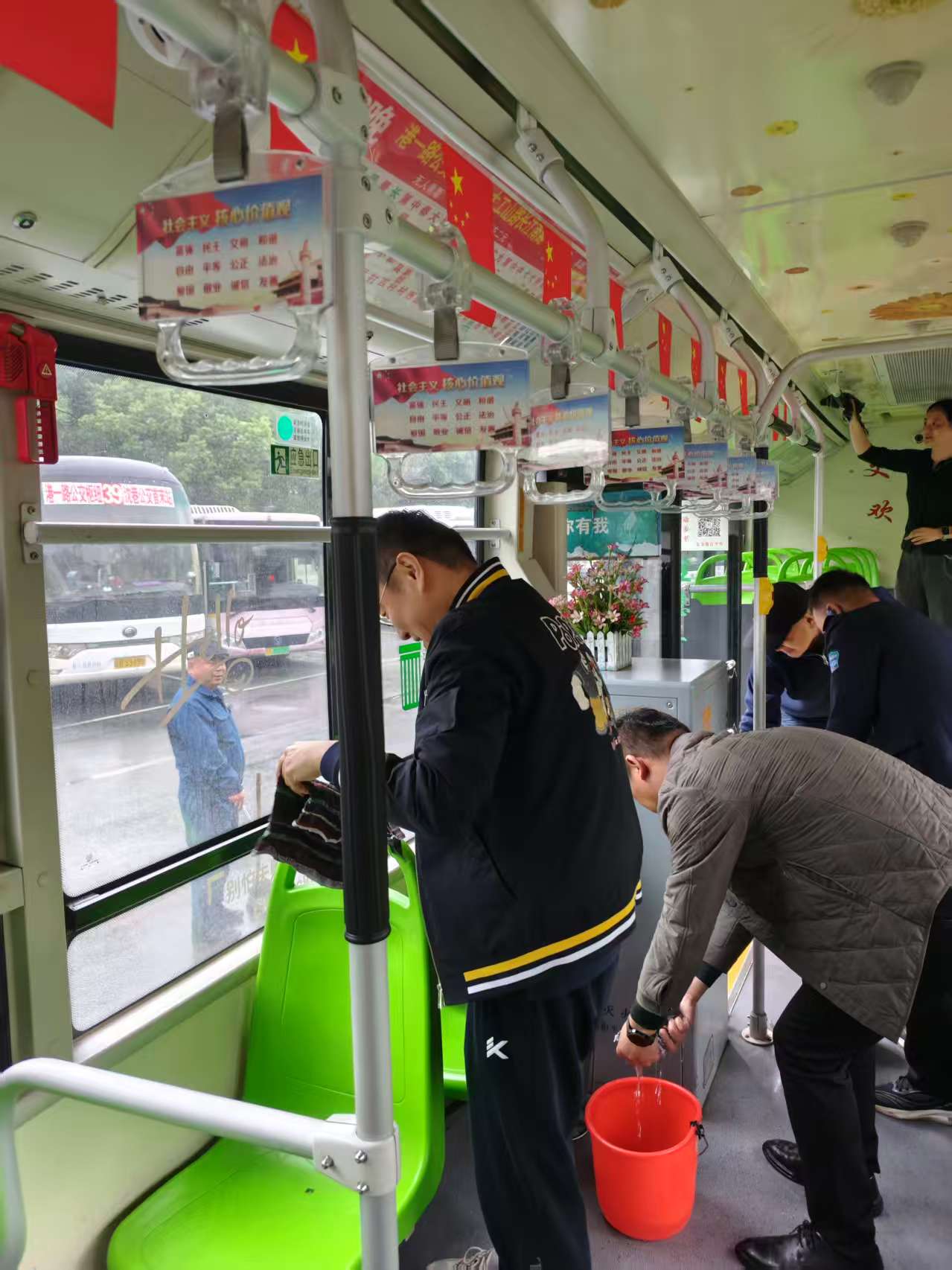 活動現(xiàn)場,黨員們手持清潔工具,對公交車輛開展全面清掃。從駕駛區(qū)到客艙座椅,不放過任何衛(wèi)生死角,將“城市窗口”擦拭得更加明亮。